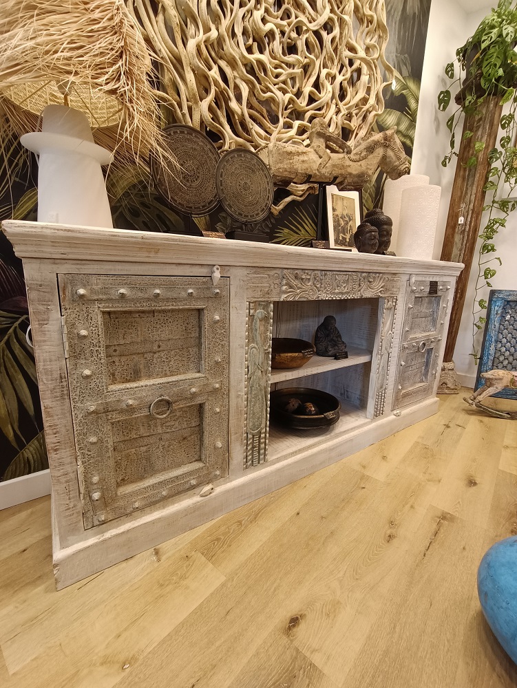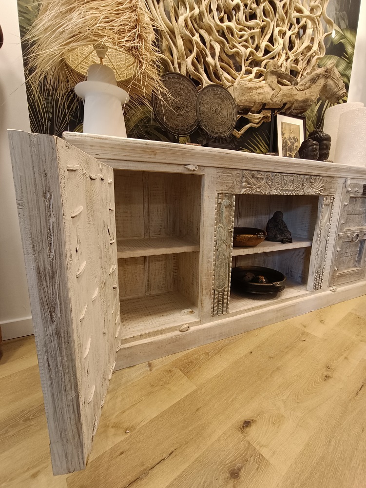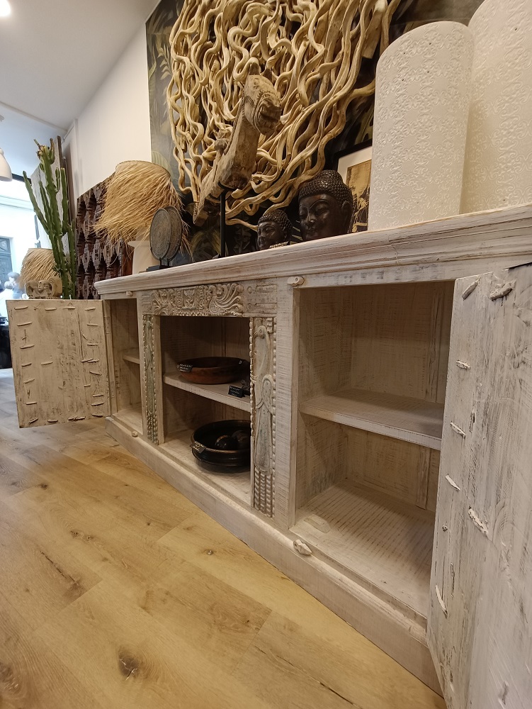 Superbe Buffet du Nord de l’Inde en bois massif, constitué d’anciennes portes et d’anciens montants en teck sculptés provenant d’Haveli (ancien petit palais ou maison de maitre du Rajasthan ou du nord de l’Inde) montées artisanalement sur une structure en sheesham (bois de rose). Avec cette magnifique pièce chez vous, vous ferez voyager vos convives et apporterez un touche d’Asie à votre intérieur !